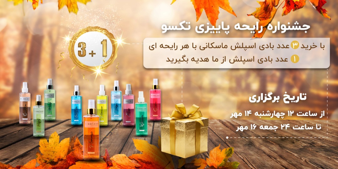 تکسو به مناسبت آغاز فصل پاییز که نمادی از شروع تحرک و پویایی ست ، جشنواره رایحه پاییزی که ویژه محصولات بادی اسپلش ماسکانی می باشد را برگزار میکند . در این جشنواره می توانید به ازای خرید هر 3 عدد بادی اسپلش ماسکانی، یک عدد بادی اسپلش به عنوان هدیه از تکسو دریافت کنید.