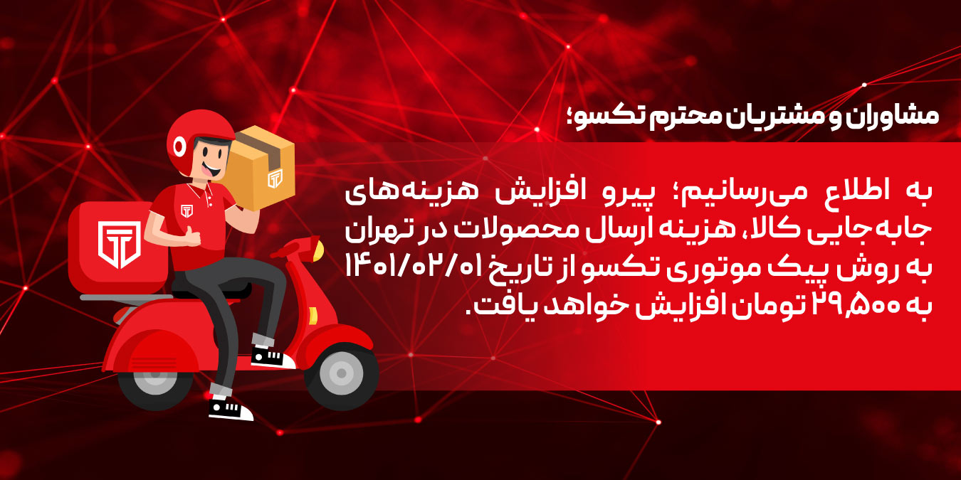 به اطلاع می‌رسانیم؛ پیرو افزایش هزینه های جابه جایی کالا، هزینه ارسال محصولات در تهران از طریق پیک موتوری تکسو از تاریخ 1401/02/01 به مبلغ 29,500 تومان افزایش خواهد یافت.