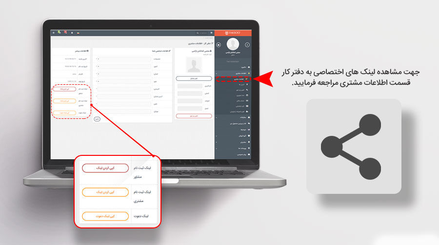 با استفاده از امکان ویژه ای که در قسمت "دفتر کار مجازی" وب سایت تکسو برای مشاوران و مدیران سازمان در نظر گرفته شده است. از این پس می توانید با مراجعه به بخش دفتر کار > داشبورد > اطلاعات مشتری >اطلاعات مشتری، لینکهای یکتا و اختصاصی خودتان را دریافت کنید و برای معرفی بهتر تجارتتان به دیگران از آن استفاده نمایید.