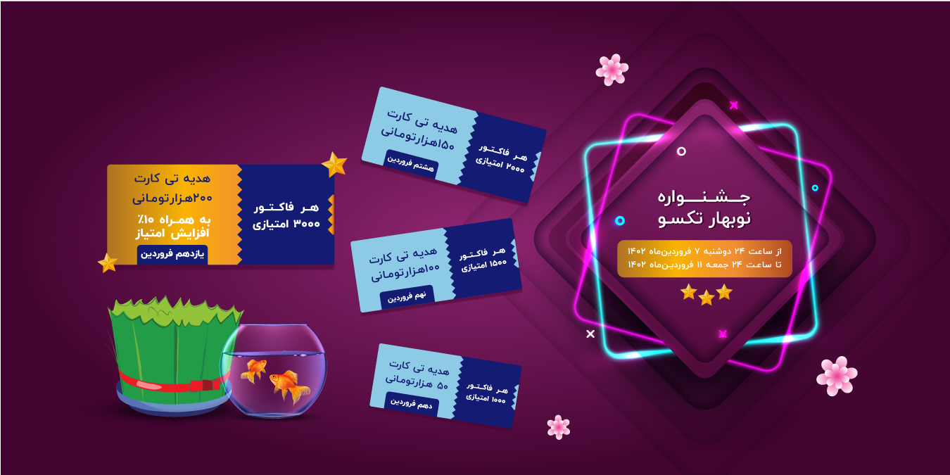در جشنواره نوبهار تکسو که از ساعت 24 دوشنبه 7 فروردین‌ماه 1402 تا ساعت 24 جمعه 11 فروردین‌ماه 1402 و طی دو مرحله برگزار می گردد، به ازای هر فاکتور با مبالغ مختلف، تی کارت های متفاوتی ارائه خواهد شد.