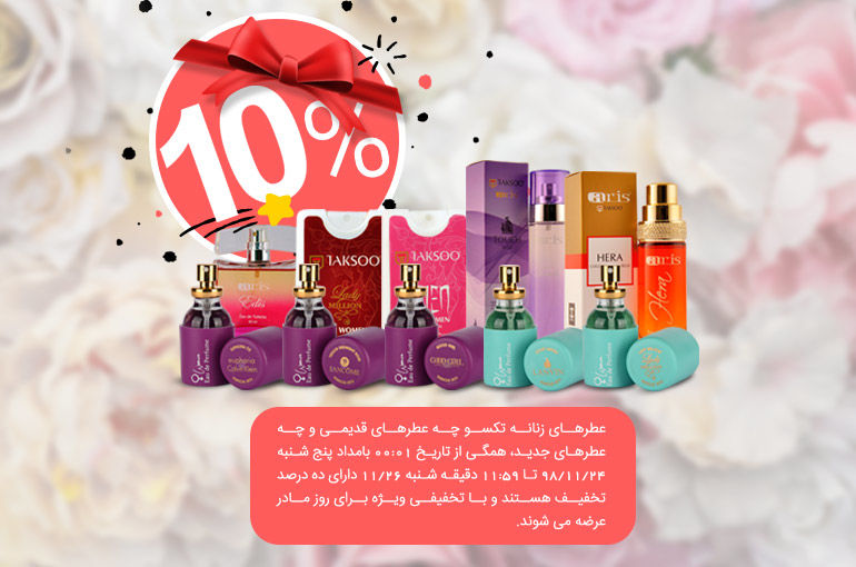 شما می توانید از تاریخ پنج شنبه 24 بهمن 98 تا پایان روز شنبه 26-11-98 عطرهای زنانه تکسو را با تخفیف از وب سایت تکسو سفارش دهید.